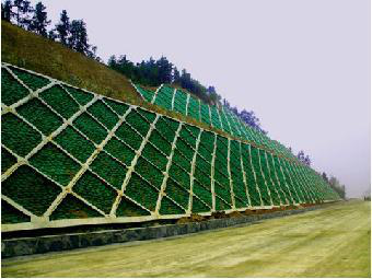 植生袋綠化,是高速公路邊坡綠化中重要的施工方法之一。因植生袋使用簡單方便,植物出苗率高,坡面綠化效果持續穩定,目前已普遍被高速公路邊坡、山體綠化工程業主認同,并以較快的速度在全國推廣應用。植生袋護坡施工工藝先將邊坡拱形骨架內多余的碎石、泥土等雜物清楚并整平,要求保證清理后的坡面比拱形骨架面低20cm以上.在植生袋低層先墊鋪5-8cm的碎石,便于坡面積水排出。用配好種子并加工好的植生袋裝填種植土,種植土中適當加入草碳土10%和復合肥500g/m。將裝好種植土的袋子由上而下均勻碼放在拱形骨架內,每碼好一排后均用腳踩實壓緊再往上繼續碼放。對于坡比大于等于1:0.5的邊坡,為保證其穩定在做好的植生袋上用米字型鐵鋼絲網拉緊,每拱中間用一根80-100cm長的&14的鋼筋固定,其它部位用50cm長的&14的鋼筋固定。按設計要求在袋子上點播灌木種子并移栽灌木后養護。